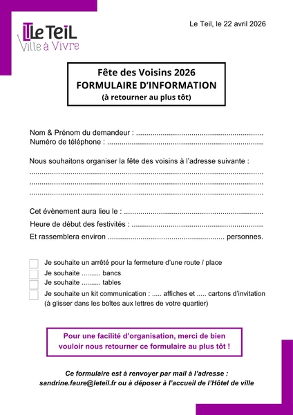 Comme chaque année, la commune vous accompagne dans l’organisation en mettant à votre disposition, si vous le souhaitez, le matériel nécessaire.