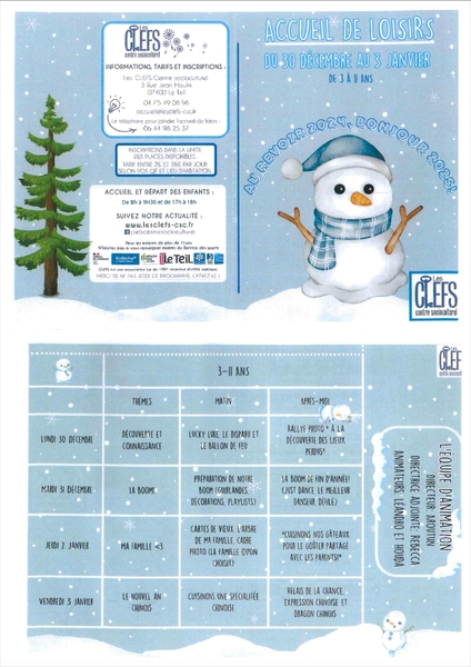 vous propose d'accueillir vos enfants (dès 3 ans et jusqu'à 11 ans) du 30 décembre au 3 janvier.